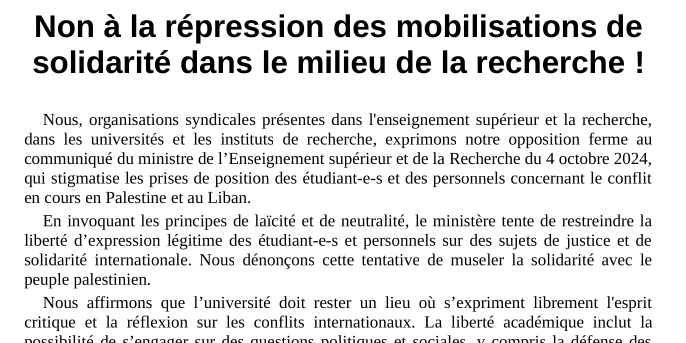 Nous, organisations syndicales présentes dans l'enseignement supérieur et la recherche, dans les universités et les instituts de recherche, exprimons notre opposition ferme au communiqué du ministre de l’Enseignement supérieur et de la Recherche du 4 octobre 2024, qui stigmatise les prises de position des étudiant-e-s et des personnels concernant le conflit en cours en Palestine et au Liban.