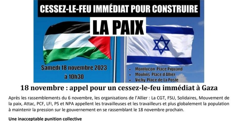 Après les rassemblements du 6 novembre, les organisations de l’Allier : La CGT, FSU, Solidaires, Mouvement de la paix, PCF, LFI, PS et NPA appellent les travailleuses et les travailleurs et plus globalement la population à maintenir la pression sur le gouvernement en se rassemblant le 18 novembre prochain.
