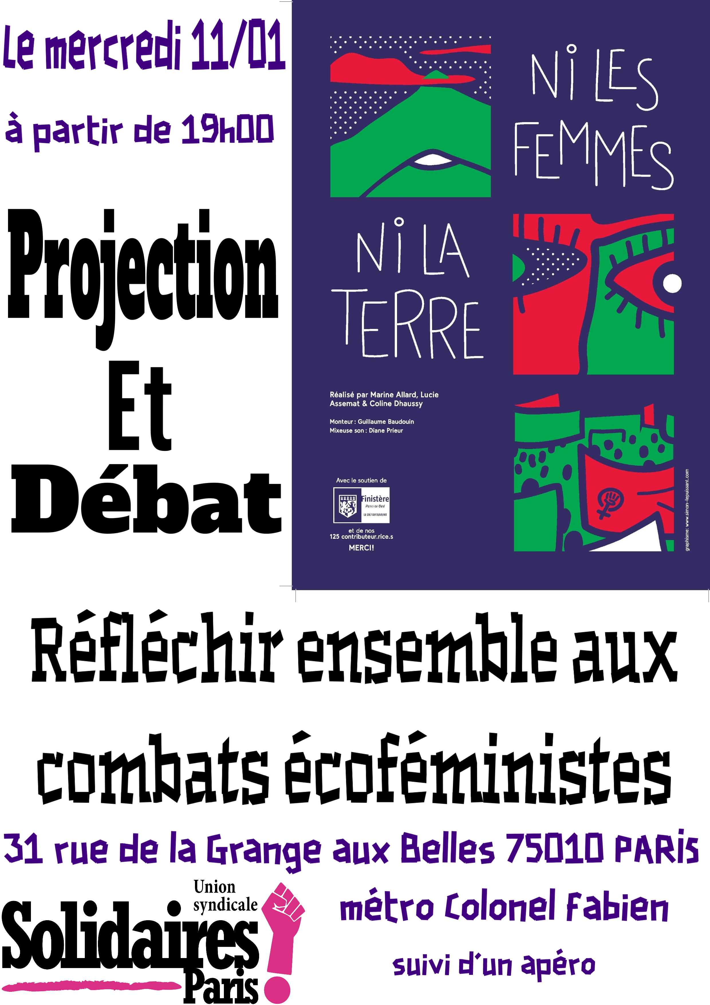 La commission féministe de Solidaires Paris et la commission Femmes de Solidaires nationale vous invite le mercredi 11 janvier à 19h a une projection du film "Ni les femmes ni la terre" (62 mns ) suivi d'un apéro-débat pour réfléchir ensemble aux combats écofeministes.