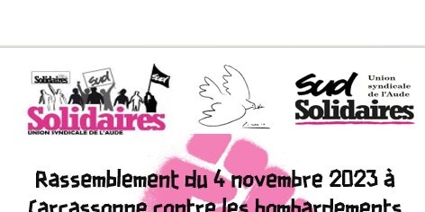 Samedi 4 novembre, deux rassemblements pour le cessez-le-feu sur Gaza ont eu lieu dans l'Aude sur la base de ce communiqué national du CNPJDPI (Collectif national pour une Paix Juste et Durable entre Palestiniens et Israéliens ) auquel participe l'Union syndicale SOLIDAIRES.