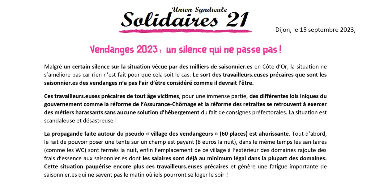 Malgré un certain silence sur la situation vécue par des milliers de saisonnier.es en Côte d’Or, la situation ne s’améliore pas car rien n’est fait pour que cela soit le cas. Le sort des travailleurs.euses précaires que sont les saisonnier.es des vendanges n’a pas l’air d’être considéré comme il devrait l’être.