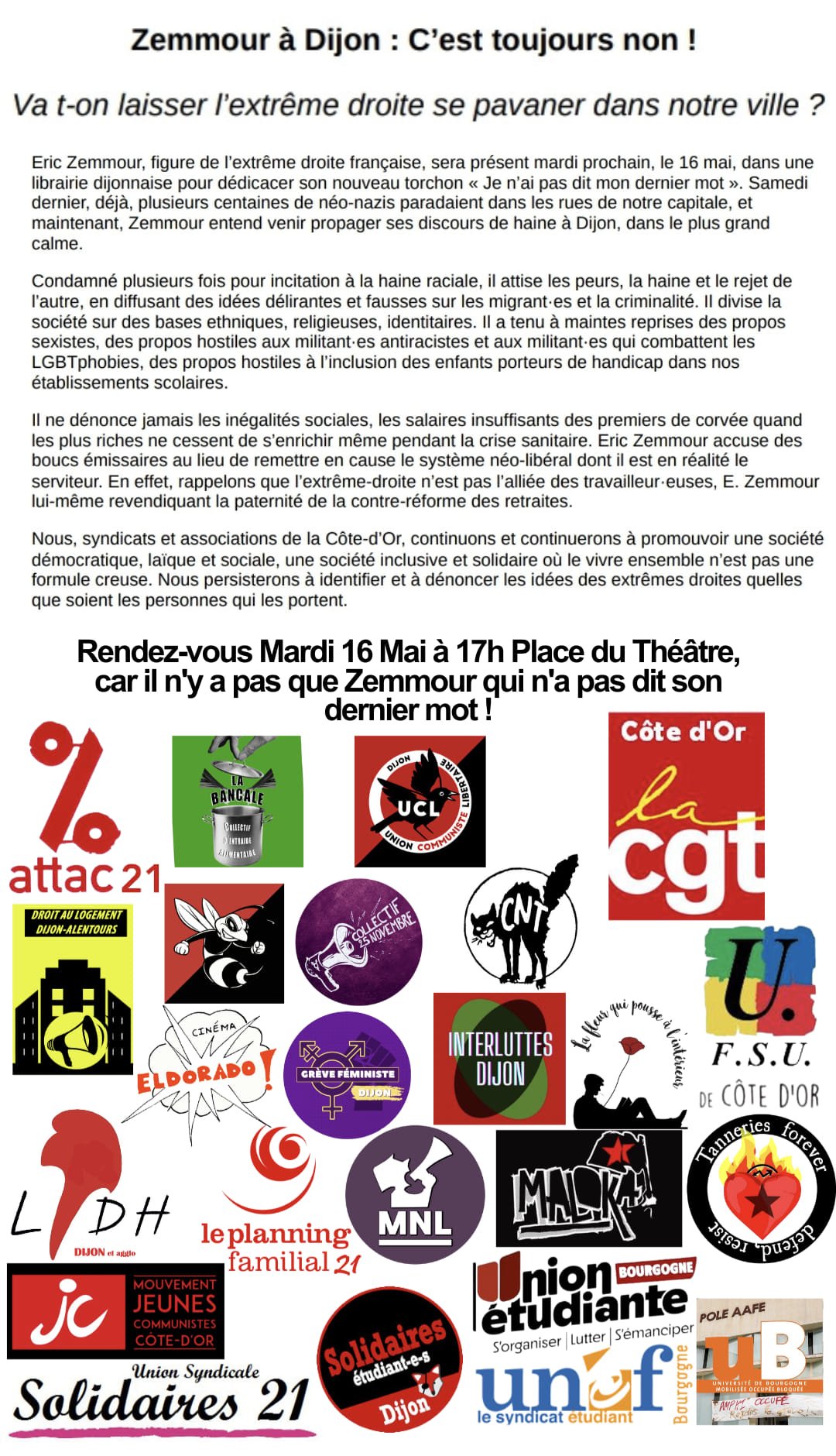 Eric Zemmour, figure de l’extrême droite française, sera présent mardi prochain, le 16 mai, dans une librairie dijonnaise pour dédicacer son nouveau torchon « Je n’ai pas dit mon dernier mot ». Samedi dernier, déjà, plusieurs centaines de néo-nazis paradaient dans les rues de notre capitale, et maintenant, Zemmour entend venir propager ses discours de haine à Dijon, dans le plus grand calme.
