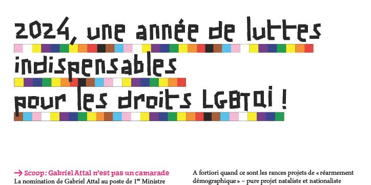 La nomination de Gabriel Attal au poste de 1er Ministre est moins un événement marquant du fait de son homosexualité, contrairement à une lecture médiatique de surface le laisserait penser, qu’un gage toujours plus marqué, par ses choix de ministres, à la droite la plus homophobe et réactionnaire : assidu·es à la Manif pour tous (Catherine Vautrin), opposant·es à la PMA (Rachida Dati) et/ou partisan·es de l’exclusion des hommes trans de la protection du droit à l'IVG (Aurore Bergé), chantre enfin de l’école privée intégriste Stanilas (AOC, Amélie Oudéa-Castéra) où le sexisme, l’homophobie et l’absence de prévention en matière de santé sexuelle sont des règles fondamentales.