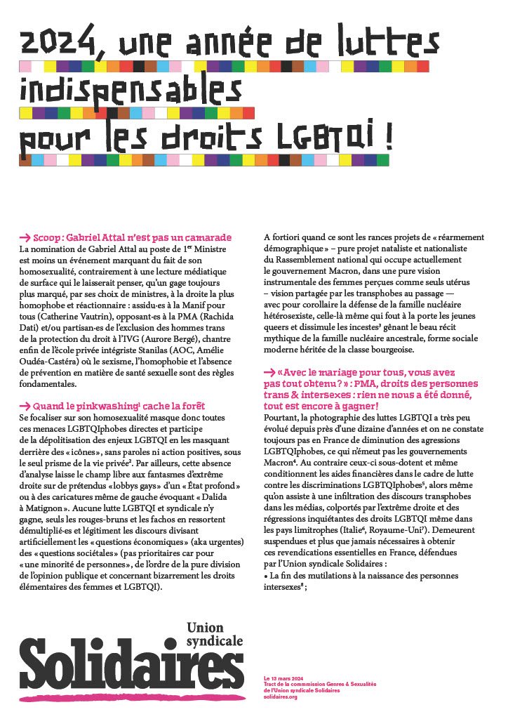 Pourtant, la photographie des luttes LGBTQI a très peu évolué depuis près d’une dizaine d’années et on ne constate toujours pas en France de diminution des agressions LGBTQIphobes, ce qui n'émeuvent pas les gouvernements Macron[v]. Au contraire ceux-ci sous-dotent et même conditionnent les aides financières dans le cadre de lutte contre les discriminations LGBTQIphobes[vi], alors même qu’on assiste à une infiltration des discours transphobes dans les médias, colportés par l’extrême-droite et des régressions inquiétantes des droits LGBTQI même dans les pays limitrophes (Italie[vii], Royaume-Uni[viii]). Demeurent suspendues et plus que jamais nécessaires à obtenir ces revendications essentielles en France, défendues par l’Union syndicale Solidaires :