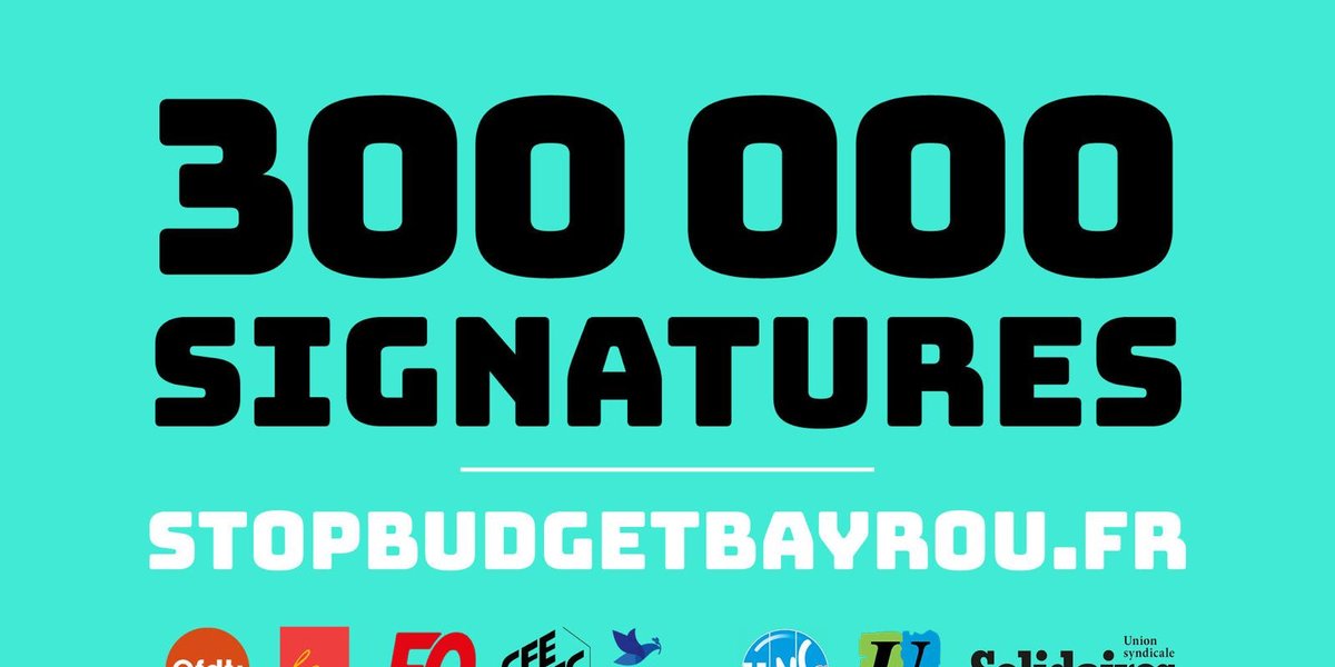 300000 signatures contre le budget Bayrou ! On continue de signer et de faire signer la signature : Budget : les sacrifices pour le monde du travail ça suffit !