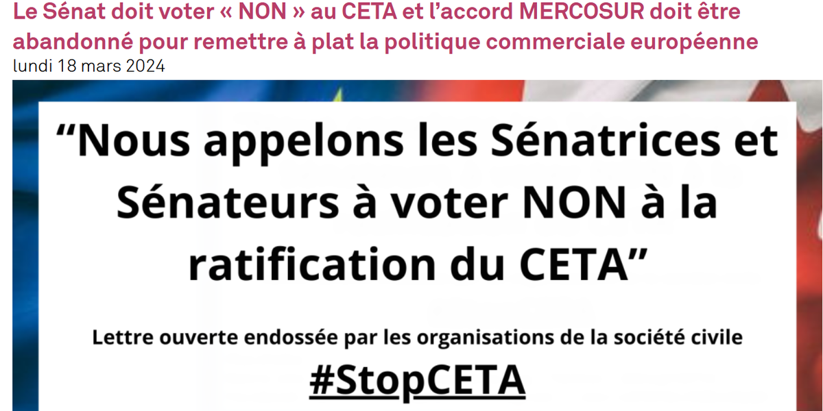 Dans une lettre ouverte signée par près de 30 organisations, le collectif Stop CETA-MERCOSUR (voir la liste de ses membres) et ses partenaires appellent les Sénatrices et Sénateurs à voter contre la ratification du CETA afin d’ouvrir la possibilité d’« une remise à plat de la politique commerciale européenne » et invitent les citoyennes et citoyens à soutenir cet appel. Aux côtés de la Confédération paysanne, le collectif national Stop CETA-MERCOSUR donne RDV à partir de 10 heures le jeudi 21 mars devant le Sénat pour demander aux sénatrices et sénateurs de voter CONTRE la ratification du CETA.