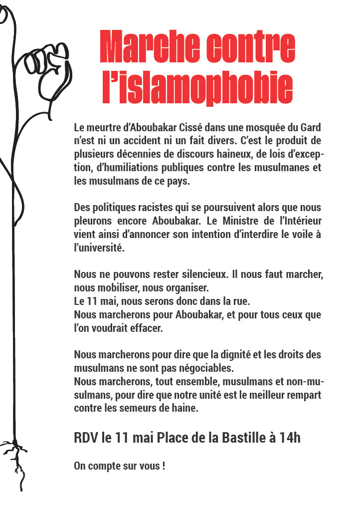 Nous marcherons pour Aboubakar, et pour tous ceux que l’on voudrait effacer. Nous marcherons pour dire que la dignité et les droits des musulmans ne sont pas négociables.