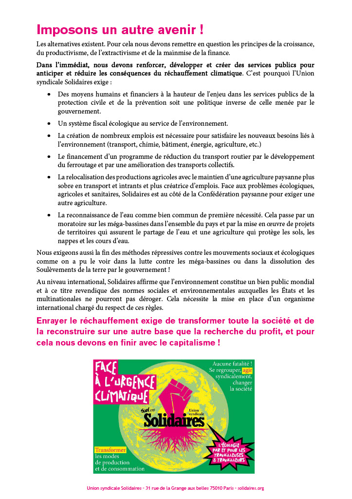 L'Union syndicale Solidaires alerte depuis longtemps sur le changement climatique et ses conséquences : sécheresse, canicule, inondation, orage de grêle…