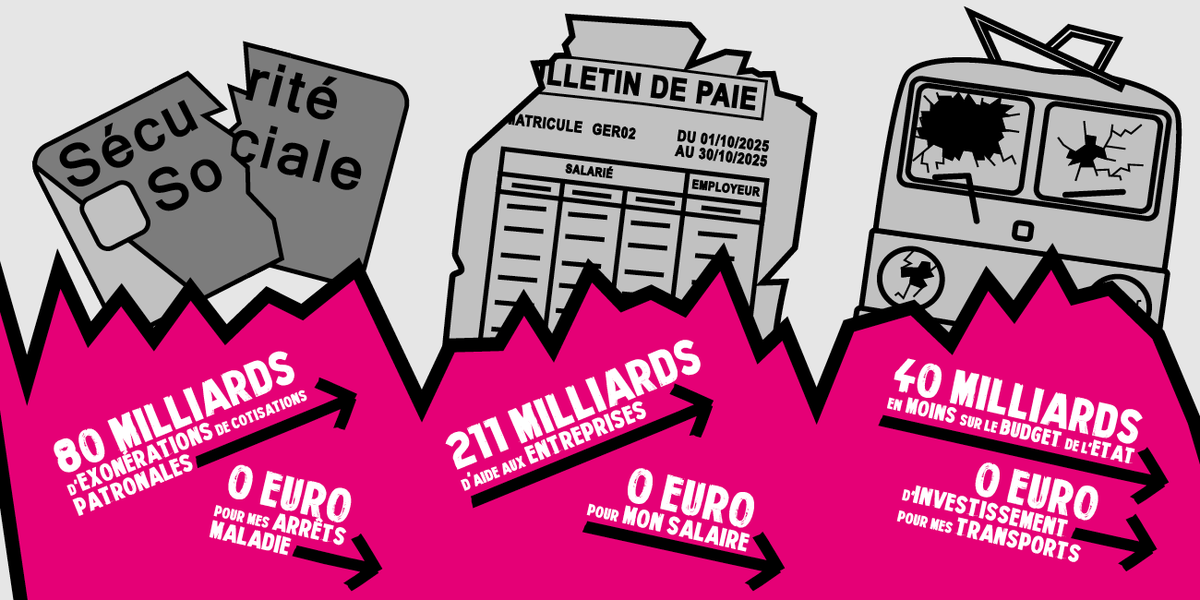 Pendant qu’on nous demande de « faire des efforts », le patronat continue de se gaver. Au moins 211 milliards d’euros d’aides publiques sont distribués chaque année aux entreprises, sans conditions, sans contrôle, sans contreparties. Ces aides finissent trop souvent… en dividendes. En 2024, ce sont 97 milliards d’euros qui ont été reversés aux actionnaires du CAC 40 tandis que ces grandes entreprises réalisent des profits records (131 milliards d’euros en 2024). De l’argent, il y en a !