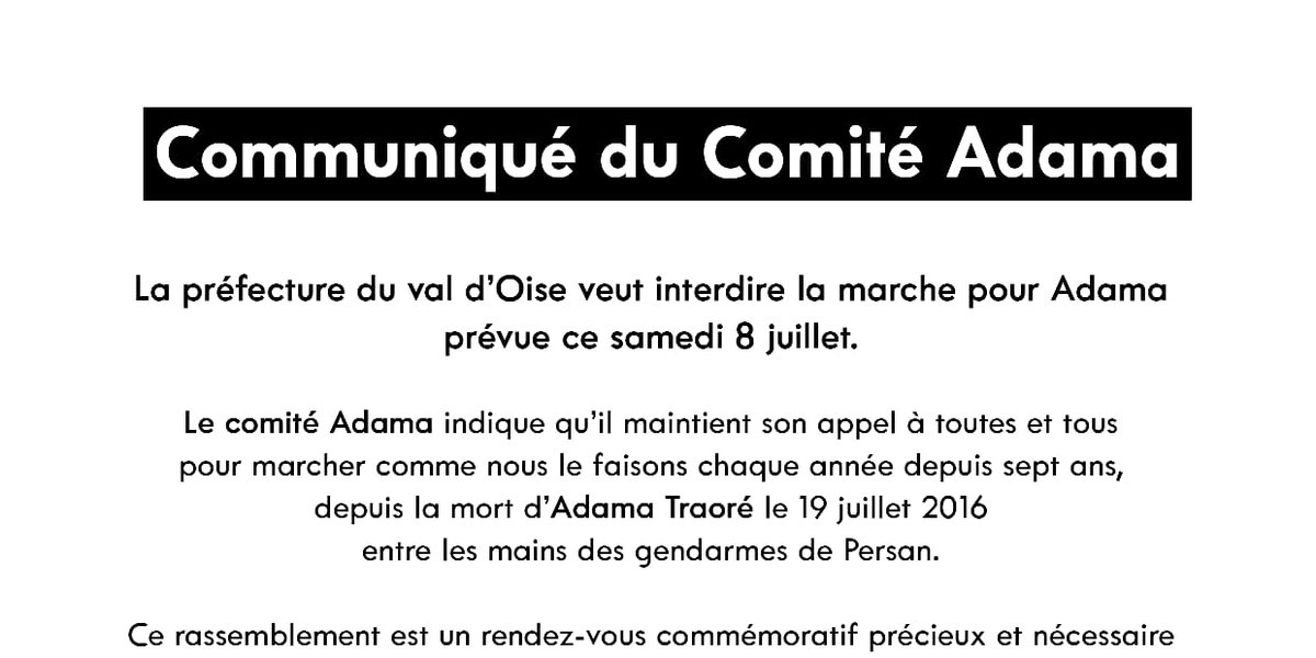 Comité Justice et Vérité pour Adama - La préfecture du Val d'Oise veut interdire la marche pour Adama prévue ce samedi 8 juillet