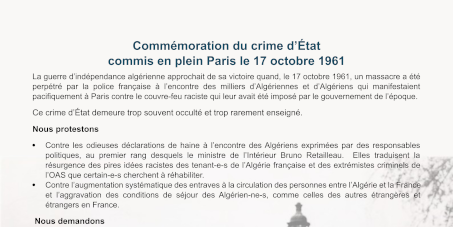 afin de rendre hommage à la mémoire de tous les Algériens qui ont été victimes des violences racistes et colonialistes de l’État français et de combattre leurs résurgences dans le présent.