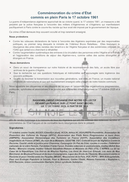 17 octobre contre l’oubli, ACCES (Chevilly-Larue), ACCA, AFPS Paris-Sud, Africa 93, AGAUREPS Prométhée, AMFPGN, AMF, APAREDESA, Apel-Égalité, Association de Promotion des Cultures du Voyage (APCV), Association des Médecins pour la Prévention de la Guerre Nucléaire (AMPGN), Association des Pieds Noirs Progressistes et leurs Amis (ANPNPA), Association Démocratique des Tunisiens en France (ADTF), ASTI de Colombes, ATTAC France, ATMF, Au nom de la Mémoire, CEDETIM, CGT, CISE, CISPM, Collectif Boycott Apartheid Israël Paris-Banlieue, Collectif Faty KOUMBA, Collectif Ivryen de Vigilance Contre le Racisme, collectif Sövkipeu, Collectif Unitaire Franco-Algérien de l’Île de France, Comité vérité et justice pour Charonne, Compagnie Un Pas de Côté, Coordination nationale Pas sans Nous, COPAF, coudes à coudes, CRID, DIEL, Euro Palestine, FASTI, Fédération nationale de la Libre Pensée, Fondation Frantz Fanon, FSE, FTCR, Histoire coloniale et postcoloniale, Institut Mehdi Ben Barka - Mémoire vivante, Institut Tribune Socialiste-Histoire et Mémoire du PSU (ITS), Jeunes Insoumis-es, JSJV, L’APRES, La Marche des Solidarités, Le 93 au Cœur de la République, Le Poing Levé, Les Ami-es de Maurice Rajsfus, Les Amis de Jean-Luc Einaudi, Les amis de Max Marchand - de Mouloud Feraoun et de leurs Compagnons, LDH, LDH Auxerre, LDH EHESS, Les Amoureux au ban public, Mouvement contre le Racisme et pour l’Amitié entre les Peuples (MRAP), Morlaix Libertés, Mouvement de la Paix, Mouvement des Progressistes, PCF, PEPS, NPA Anticapitaliste, Palestine Vivra !, Pour une Écologie Populaire et Sociale, Pour la Mémoire - Contre l’Oubli, Renouveau Syndical, RESOCI-Algérie-Point-com, Réseau Féministe « Ruptures », Révolution Permanente, ROSMERTA, SNPES.PJJ-FSU, Solidaires Étudiant-e-s, Solidarités Asie France, SOS Racisme, Survie, Union étudiante, UJFP, Union communiste libertaire, Union syndicale Solidaires, Utopia 56,...