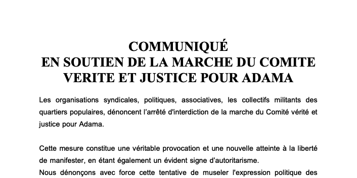 Les organisations syndicales, politiques, associatives, les collectifs militants des quartiers populaires, dénoncent l’arrêté d'interdiction de la marche du Comité vérité et justice pour Adama.
