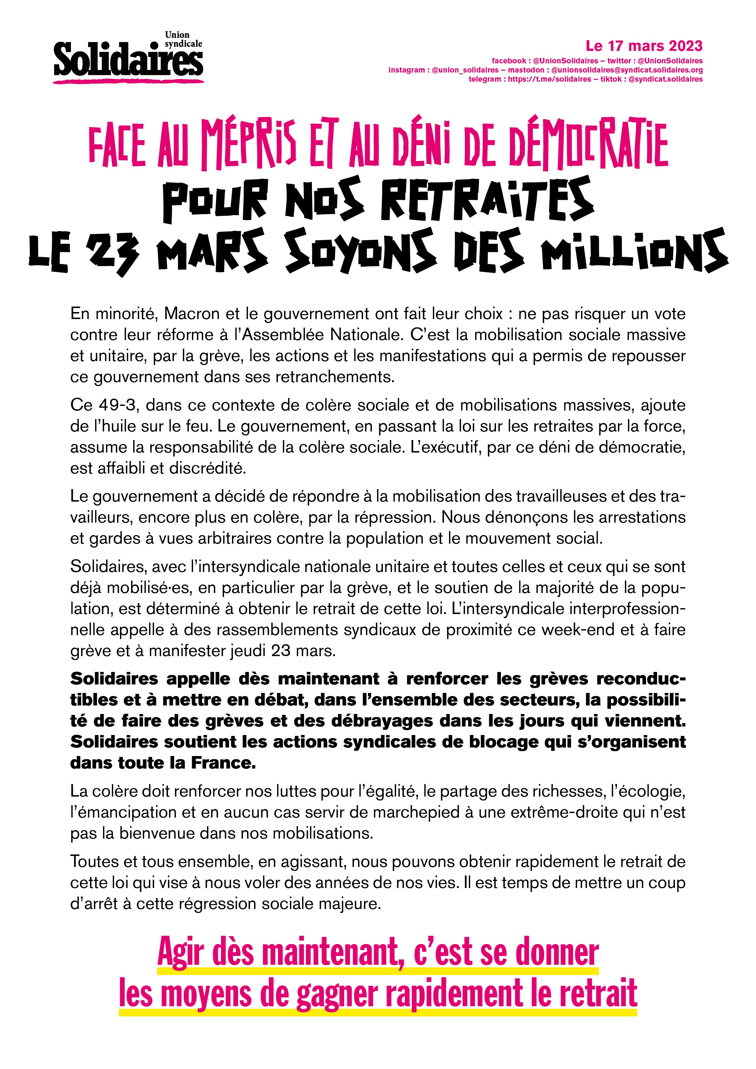 Solidaires, avec l’intersyndicale nationale unitaire et toutes celles et ceux qui se sont déjà mobilisé·es, en particulier par la grève, et le soutien de la majorité de la population, est déterminé à obtenir le retrait de cette loi. L’intersyndicale interprofessionnelle appelle à des rassemblements syndicaux de proximité ce week-end et à faire grève et à manifester jeudi 23 mars.