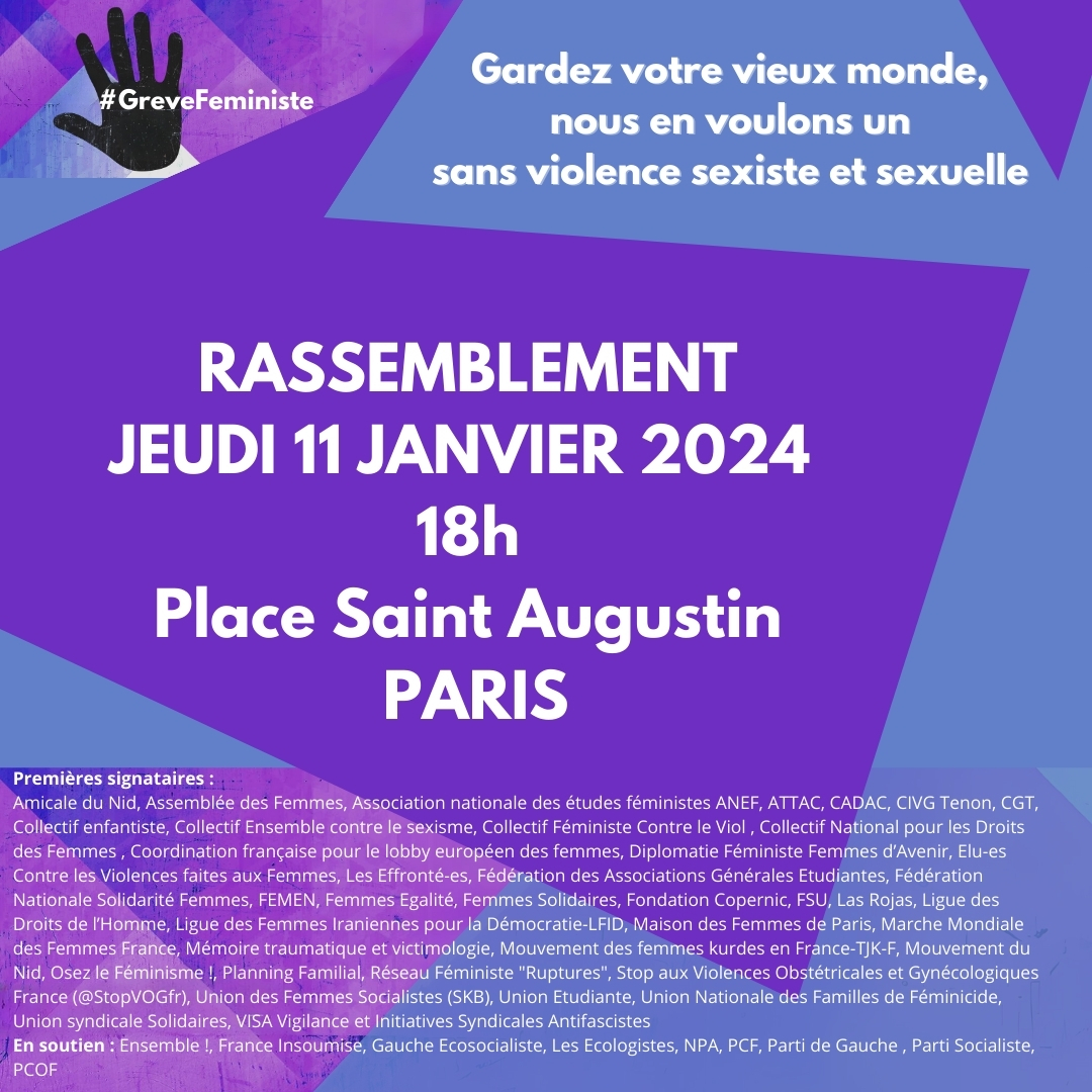 Nous appelons toutes celles et ceux qui défendent les droits des femmes, des enfants et des minorités de genres, et qui refusent les violences sexistes et sexuelles à des rassemblements devant toutes les préfectures ou les palais de Justice de France le Jeudi 11 janvier 2024.