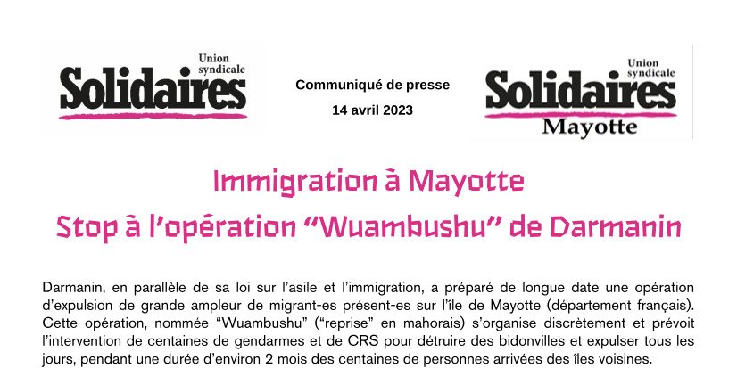 Communiqué de presse de l'Union syndicale Solidaires et de Solidaires Mayotte