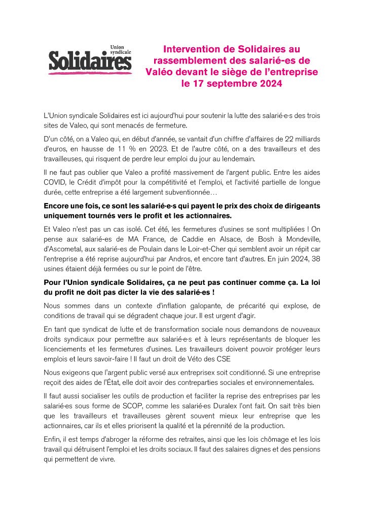 L’Union syndicale Solidaires est ici aujourd’hui pour soutenir la lutte des salarié·e·s des trois sites de Valeo, qui sont menacés de fermeture.
