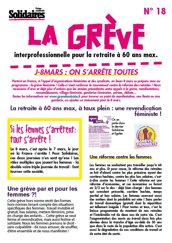 Le 8 mars, c’est après le 7 mars, le jour où la France s’arrête ! Pour Solidaires, ces deux journées n’en sont qu’une ! Les rôles multiples que jouent les femmes - la double voire triple journée de travail - font tourner cette société.