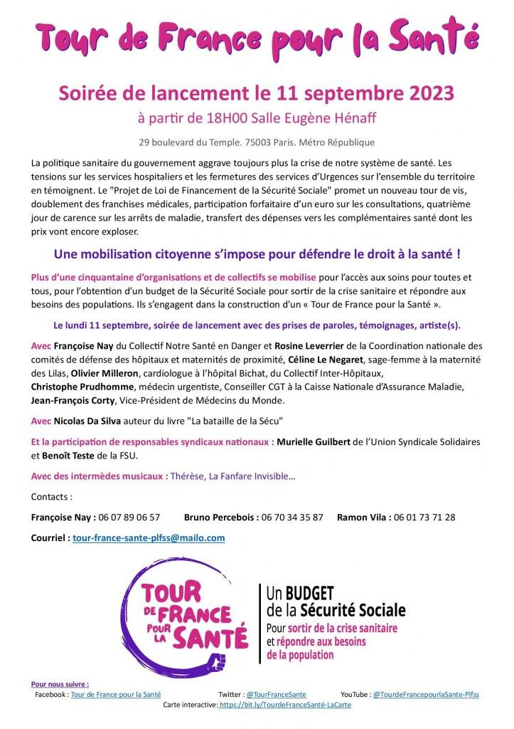 Plus d’une cinquantaine d’organisations et de collectifs se mobilise pour l’accès aux soins pour toutes et tous, pour l’obtention d’un budget de la Sécurité Sociale pour sortir de la crise sanitaire et répondre aux besoins des populations. Ils s’engagent dans la construction d'un « Tour de France pour la Santé ».