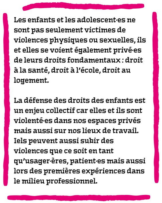 La défense des droits des enfants est un enjeu collectif car elles et ils sont violenté·es dans nos espaces privés mais aussi sur nos lieux de travail. Iels peuvent aussi subir des violences que ce soit en tant qu’usager·ères, patient·es mais aussi lors des premières expériences dans le milieu professionnel.