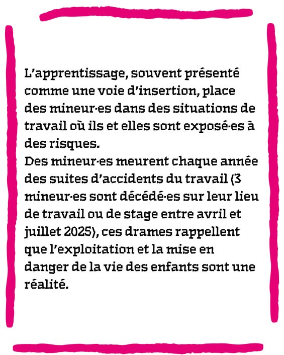 L'apprentissage, souvent présenté comme une voie d'insertion, place des mineur·es dans des situations de travail où ils et elles sont exposé·es à des risques. Des mineur·es meurent chaque année des suites d'accidents du travail (3 mineur·es sont décédé·es sur leur lieu de travail ou de stage entre avril et juillet 2025), ces drames rappellent que l'exploitation et la mise en danger de la vie des enfants sont une réalité.