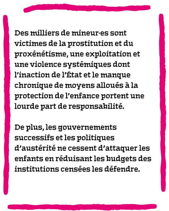 Des milliers de mineur·es sont victimes de la prostitution et du proxénétisme, une exploitation et une violence systémiques dont l'inaction de l'État et le manque chronique de moyens alloués à la protection de l'enfance portent une lourde part de responsabilité.
