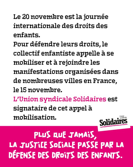 Pour défendre leurs droits, le collectif enfantiste appelle à se mobiliser et à rejoindre les manifestations organisées dans de nombreuses villes en France, le 15 novembre. L’Union syndicale Solidaires est signataire de cet appel à mobilisation.