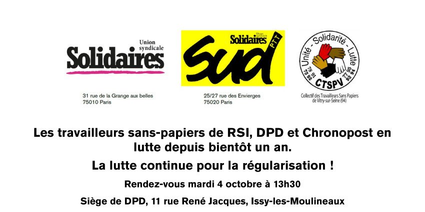 M. Darmanin a reçu ce 29 septembre une délégation suite à l’interpellation de Mme Faucillon, députée des Hauts-de-Seine en commission de lois concernant la situation du piquet de RSI à Gennevilliers. Aucune réponse n’a été donnée concernant les piquets de DPD et Chronopost alors même que l’État est un actionnaire stratégique du donneur d’ordre qu’est La Poste. Nous demandons donc des réponses concrètes pour la régularisation de l’ensemble des occupants des 3 piquets, lutte qui dure depuis bientôt un an. Nous réitérons donc notre demande, restée sans réponse, qu’une délégation des 3 piquets et de nos organisations soit reçue au Ministère de l’Intérieur en ce sens.