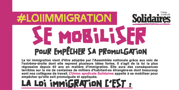 La loi immigration vient d’être adoptée par l’Assemblée nationale grâce aux voix de l’extrême-droite dont elle reprend plusieurs idées fortes. Il s’agit de la loi la plus régressive depuis 40 ans en matière d’immigration. Elle aura des conséquences terribles sur la vie de centaines de milliers d’habitant·es étrangère·es dont beaucoup sont nos collègues de travail. L’Union syndicale Solidaires appelle à se mobiliser pour empêcher qu’elle soit promulguée et appliquée.