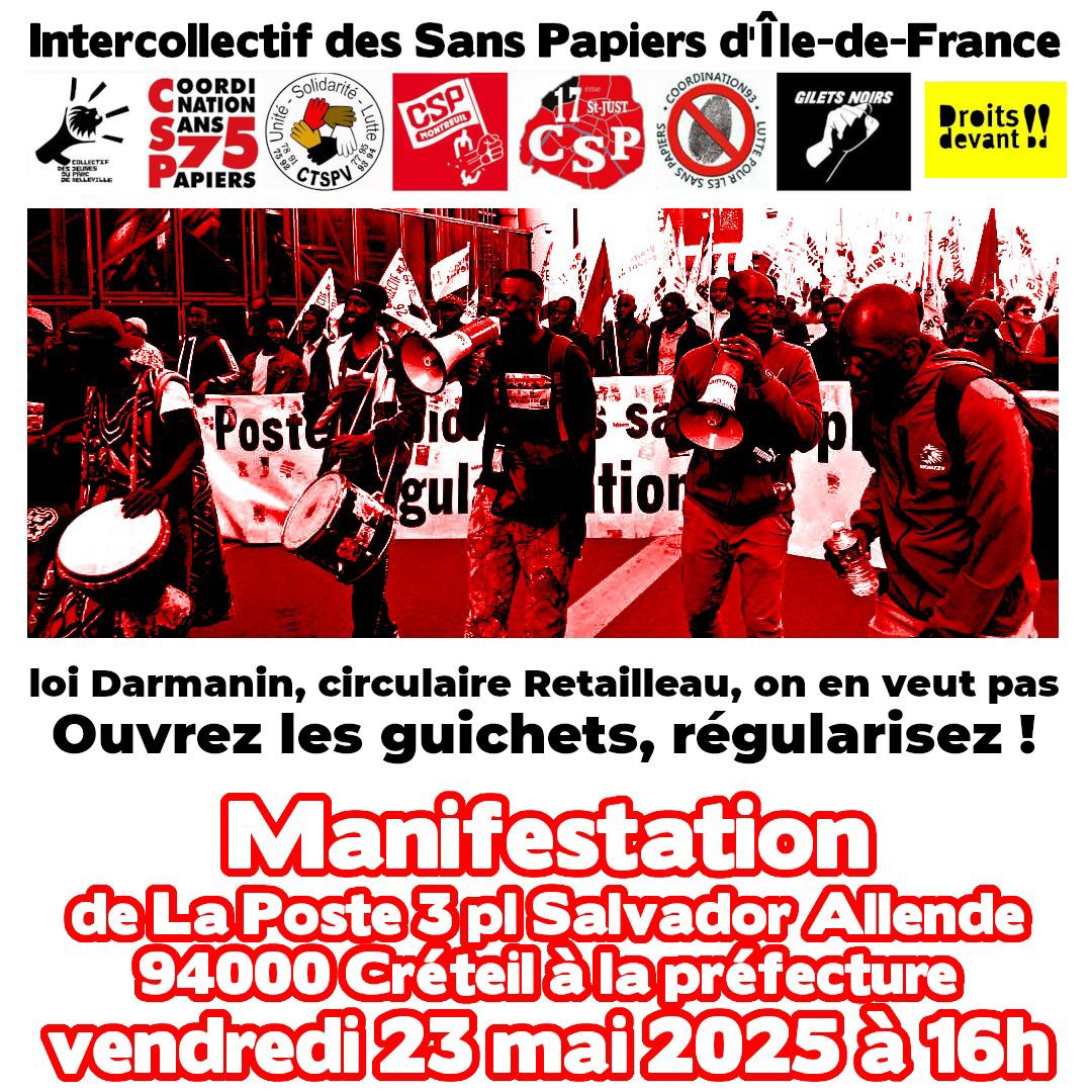 Avec les travailleurs sans-papiers du piquet Chronopost Alfortville Contre les OQTF, pour leur régularisation, Vendredi 23 mai 2025 - 16H Manifestation de La Poste, 3 Place S. Allende, jusqu’à la préfecture à Créteil.