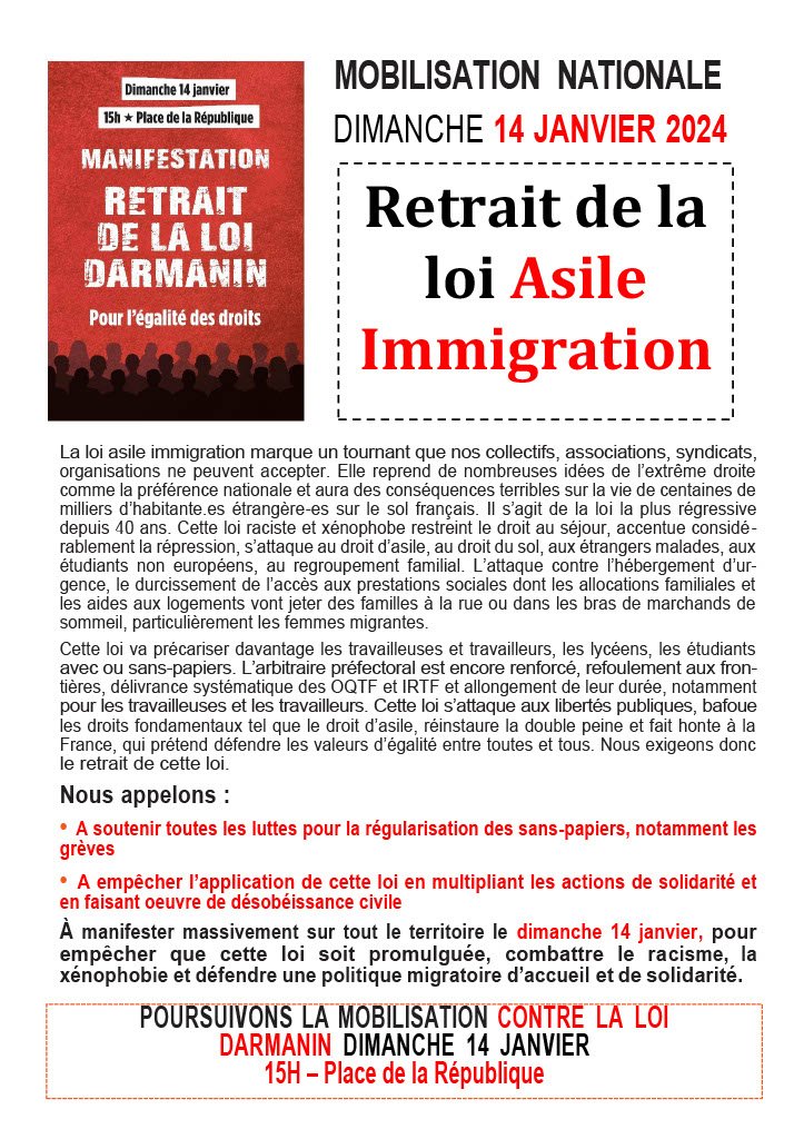 - À manifester massivement sur tout le territoire le dimanche 14 janvier, pour empêcher que cette loi soit promulguée, combattre le racisme, la xénophobie et défendre une politique migratoire d’accueil et de solidarité.