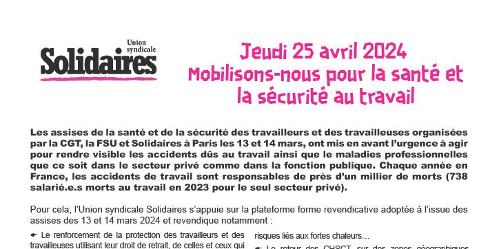 Pour cela, l’Union syndicale Solidaires s’appuie sur la plateforme forme revendicative adoptée à l’issue des assises des 13 et 14 mars 2024 et revendique notamment :