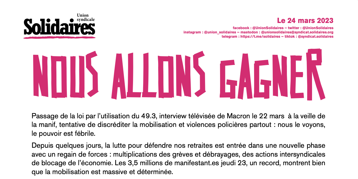 Passage de la loi par l’utilisation du 49.3, interview télévisée de Macron le 22 mars à la veille de la manif, tentative de discréditer la mobilisation et violences policières partout : nous le voyons, le pouvoir est fébrile.
