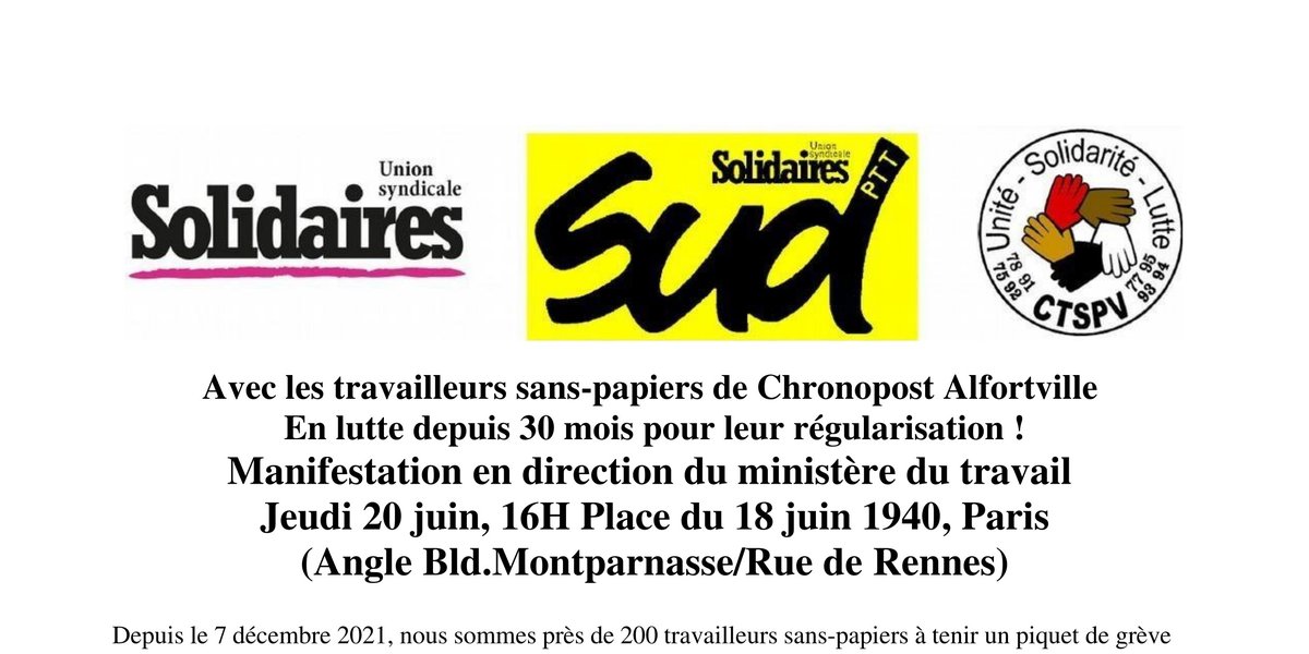 (Paris) Manifestation le 20 juin des travailleurs sans-papiers de Chronopost Alfortville en lutte depuis 30 mois pour leur régularisation !