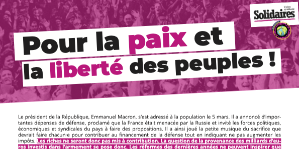 Pour Solidaires, il ne doit pas y avoir de profits privés sur des dépenses publiques. L’industrie de l’armement doit faire l’objet d’un débat sur son contrôle démocratique et l’affectation de ses profits. C’est une question de justice sociale mais aussi de souveraineté et de contrôle démocratique. Les États-Unis ont montré qu’ils pouvaient rendre inutilisables des armements déjà fournis à l’Ukraine. Une défense crédible doit être souveraine. Cela passe par la sortie de l’OTAN et l’arrêt immédiat des licenciements et fermetures d'usines dans des secteurs stratégiques. C’est une question de cohérence.