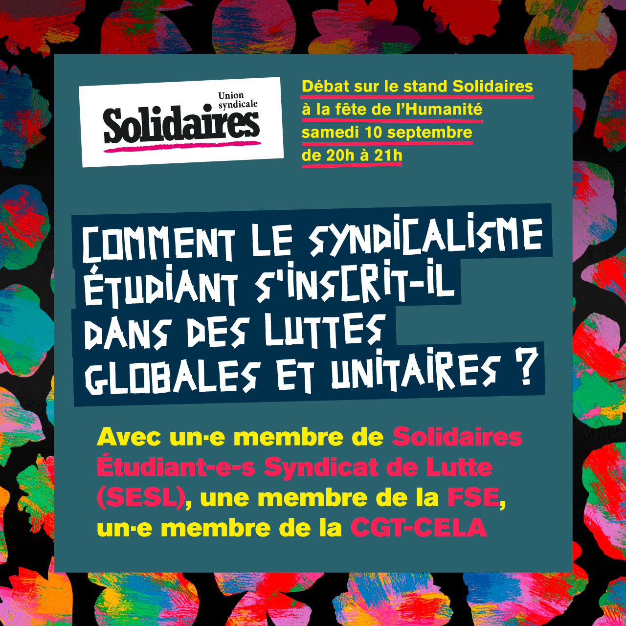 Avec: un.e membre de Solidaires Etudiant-e-s Syndicat de Lutte (SESL), une membre de la FSE, un.e membre de la CGT-CELA