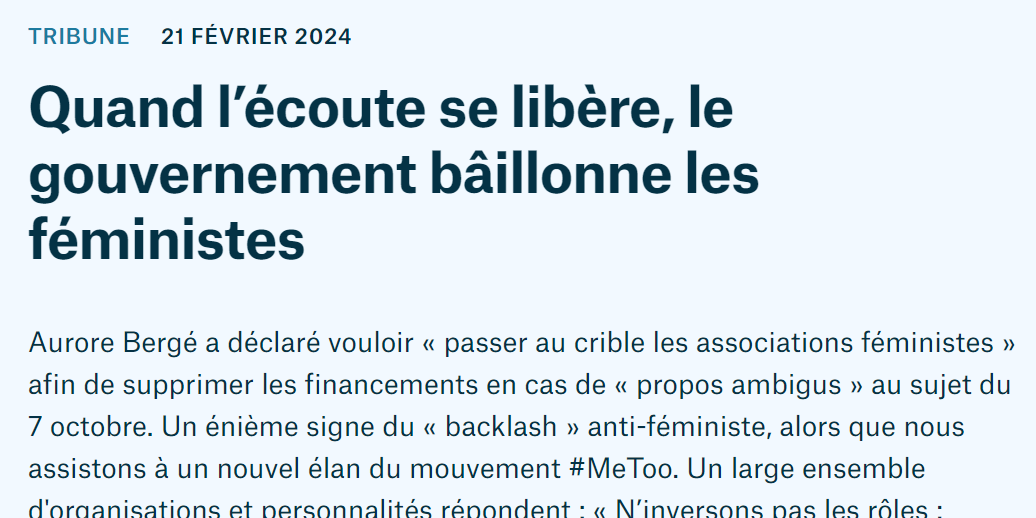 Dimanche 11 février, Aurore Bergé, Ministre déléguée de l'Égalité entre les femmes et les hommes, de la Diversité et de l'Égalité des chances a déclaré vouloir « passer au crible toutes les associations féministes soutenues financièrement par le gouvernement » afin de supprimer les financements de celles qui auraient tenu des « propos ambigus au sujet du 7 octobre ». Depuis des années, les organisations féministes alertent sur l’indigence des budgets alloués à la lutte contre les violences sexistes et sexuelles et dénoncent l’inaction des pouvoirs publics. Avec cette déclaration, Aurore Bergé et le gouvernement font diversion pour se déresponsabiliser de la lutte contre les violences en France.