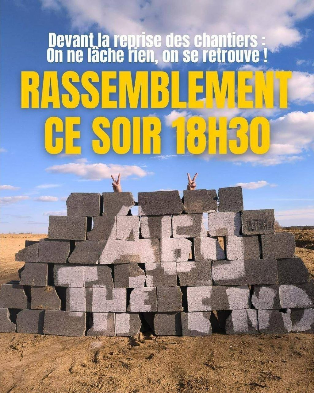 🔥 Après la joie de l'arrêt du chantier le 27 février dernier, beaucoup d'entre nous sont pris-e-s par la sidération en cette période où nous luttons avec acharnement et où les pouvoirs publics - de l'artificialisation des terres aux pesticides - piétinent l'ensemble des mesures écologiques et poussent à la destruction accélérée de nos milieux de vie. 💖 Ce soir, il est essentiel de nous retrouver, pour crier notre rage dénoncer la mainmise du pouvoir sur la justice, son acharnement, sa violence... et préparer ensemble la riposte.