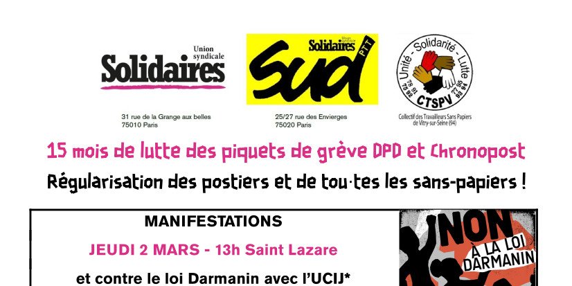 Cependant, aucune réponse n’a été donnée concernant les piquets des postiers sans-papiers de DPD et Chronopost, aucune réponse alors même que l’Etat est un actionnaire stratégique du donneur d’ordre qu’est La Poste. Malgré plusieurs manifestations et demandes d’audience, le ministère de l’intérieur n’a jamais reçu les représentants des grévistes de DPD et Chronopost, ni leurs soutiens syndicaux !