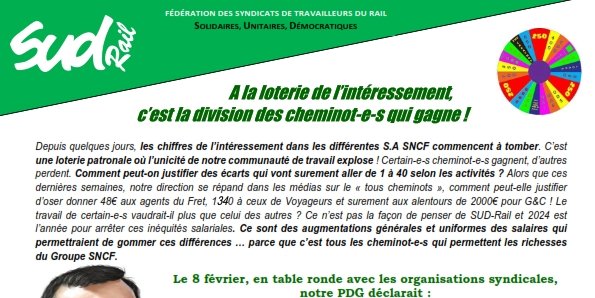 Depuis quelques jours, les chiffres de l’intéressement dans les différentes S.A SNCF commencent à tomber. C’est une loterie patronale où l’unicité de notre communauté de travail explose !