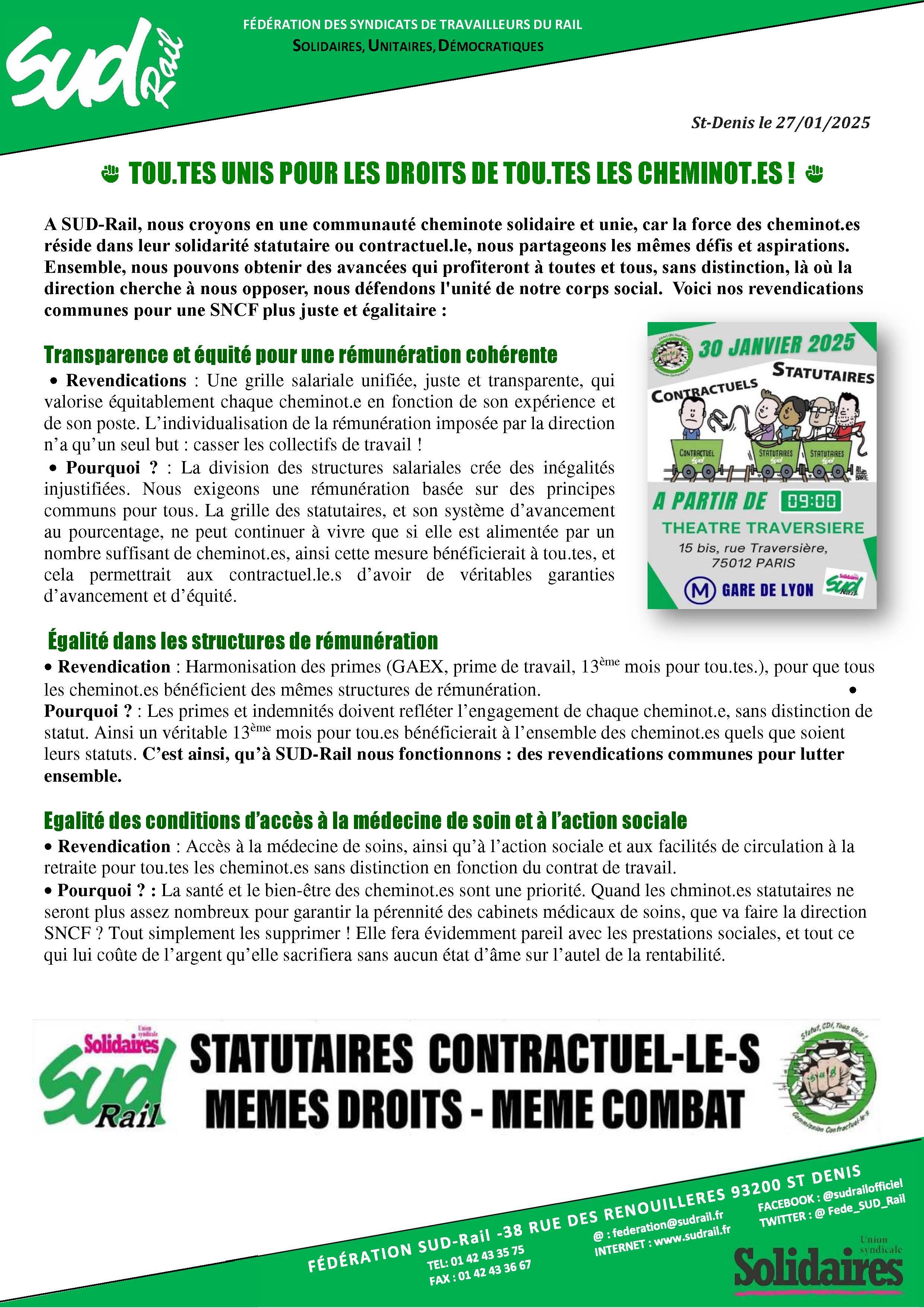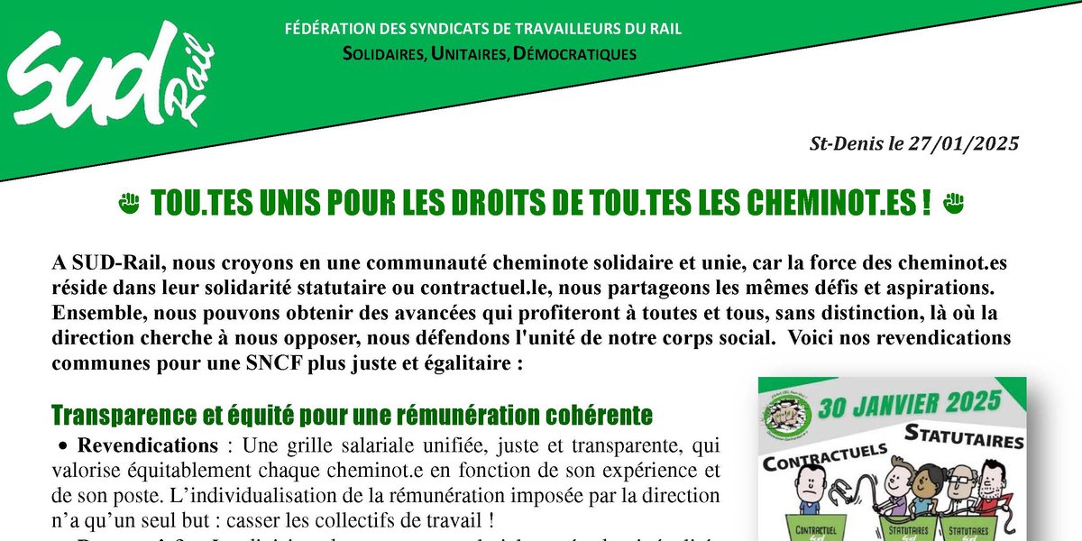 Ensemble, nous pouvons obtenir des avancées qui profiteront à toutes et tous, sans distinction, là où la direction cherche à nous opposer, nous défendons l'unité de notre corps social. Voici nos revendications communes pour une SNCF plus juste et égalitaire.