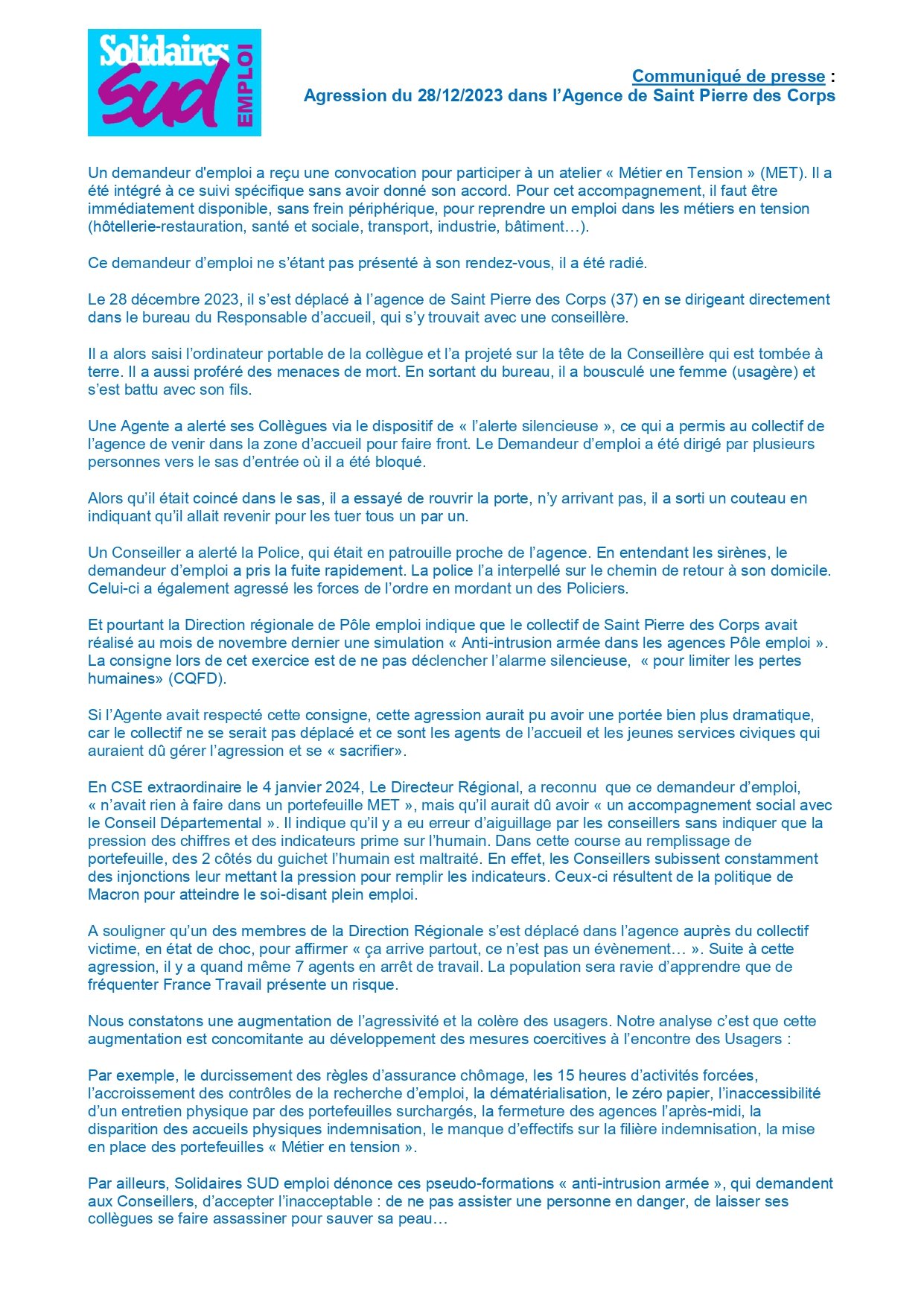 Agression du 28/12/2023 dans l’Agence de Saint Pierre des Corps