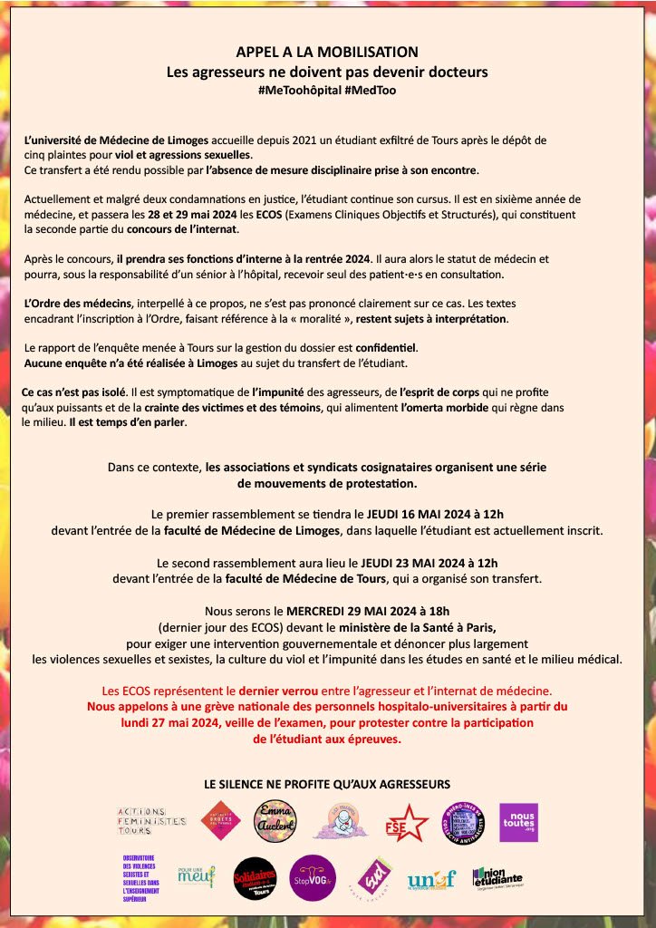 - Nous serons le MERCREDI 29 MAI 2024 à 18h (dernier jour des ECOS) devant le ministère de la Santé à Paris, pour exiger une intervention gouvernementale et dénoncer plus largement les violences sexuelles et sexistes, la culture du viol et l’impunité dans les études en santé et le milieu médical. Les ECOS représentent le dernier verrou entre l’agresseur et l’internat de médecine.