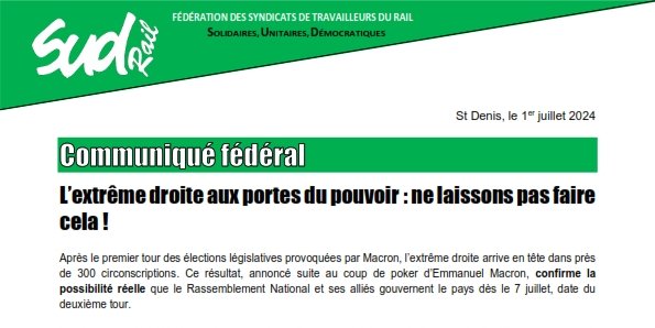 Nous appelons tous-tes nos militant-es et plus généralement tous-tes les cheminot-es et travailleur-euses du rail à s’unir et à lutter par tous les moyens pour empêcher l’extrême droite de gouverner. Nous avons une semaine pour agir et poursuivre les initiatives déjà engagées les semaines précédentes : aller à la rencontre de nos collègues, débattre, diffuser des tracts destinés aux usagers, porter nos revendications ... Il y a urgence ; mobilisons-nous !