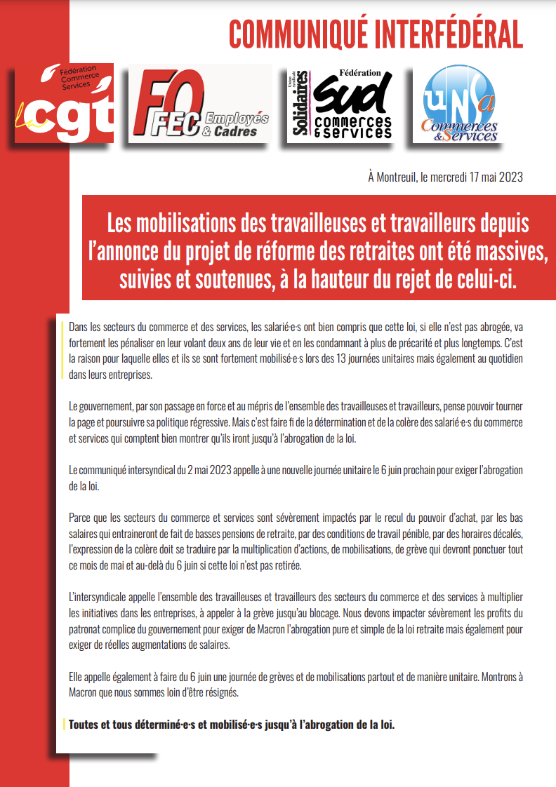 Parce que les secteurs du commerce et services sont sévèrement impactés par le recul du pouvoir d’achat, par les bas salaires qui entraineront de fait de basses pensions de retraite, par des conditions de travail pénible, par des horaires décalés, l’expression de la colère doit se traduire par la multiplication d’actions, de mobilisations, de grève qui devront ponctuer tout ce mois de mai et au-delà du 6 juin si cette loi n’est pas retirée.