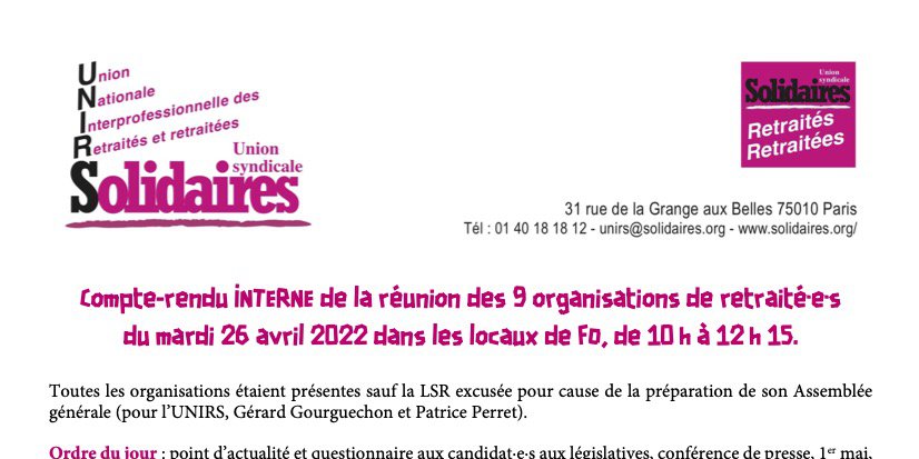 Les 9 organisations de retraité·e·s, après le point d’actualité des Présidentielles, ont élaboré un questionnaire aux candidat·e·s aux législatives qui sera annoncé par une conférence de presse. Elles ont discuté du 1er mai, informé de la réunion du Conseil de l'âge HCFEA sur le financement de l’autonomie par l’assurance privée.