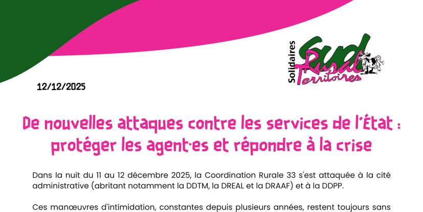 Ce soutien est la seule façon d’éviter un drame et que quelques agriculteurs, poussés par la colère ou la détresse, s’en prennent réellement aux agent·es qui essaient de réaliser leurs missions de service public de l’agriculture et de l’environnement.