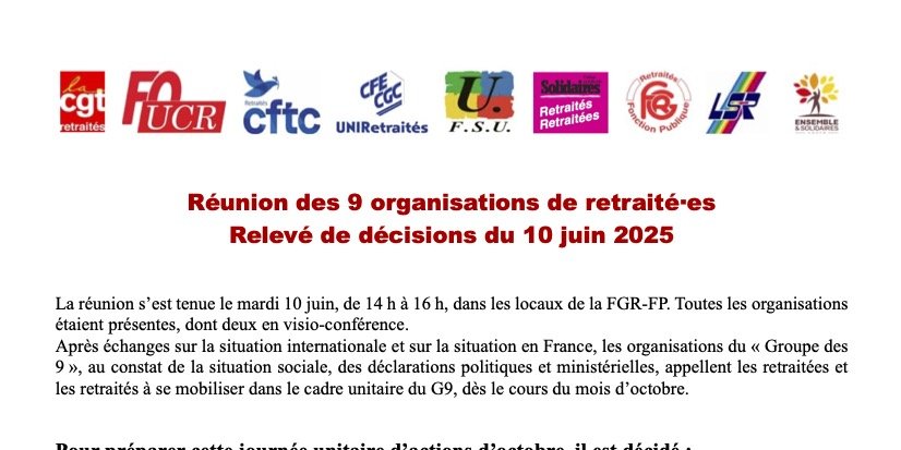 Voici le relevé de décisions du G9, les 9 organisations de retraité·es, réunies le 10 juin 2025, qui comporte l'annonce d'une action en octobre.