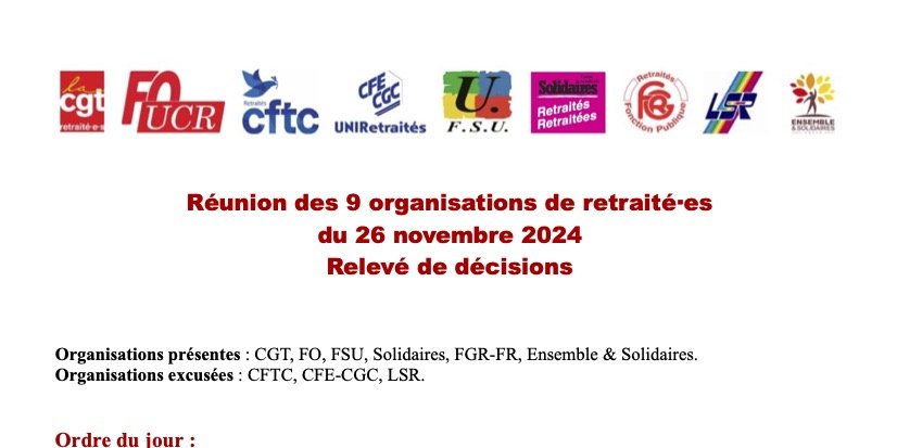 Voici le compte-rendu complet de la réunion des 9 organisations de retraité·es du 26 novembre 2024, ainsi que le relevé de décisions (ci-dessous)