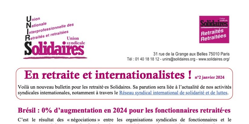 Voilà un nouveau bulletin pour les retraité∙es Solidaires. Sa parution est liée à l’actualité de nos activités syndicales internationales, notamment à travers le Réseau syndical international de solidarité et de luttes.
